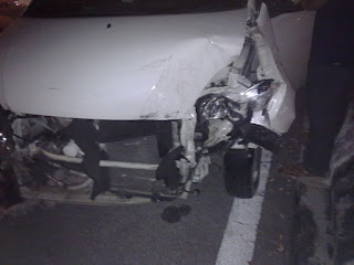 Malam Raya : Kereta adik (Dilah) xcident di traffic light persiaran bandar baru bangi. Nasib baik tak de apa-apa setakat cedera di mulut. Adik sorang lagi (Yan) pulak kepala terhentak kat front mirror kes tak pakai seat belt. Walhal selalunya masuk kete terus pakai seat belt. Aduhai..Nak jadi, nak buat camne..Ni kes pemandu lalai, langgar lampu merah! Tak reti nak bezakan lampu merah @ hijau. Kelas memandu dia mengajar Merah - JALAN, Hijau - BERHENTI.  Orang lain jadi mangsa..Malam tu masa report kat balai, nak je saya ganyang pemandu tu. Umur dah tua pun akal takde! Dahlah takde kata maaf ke apa..Blah macam tu je, tinggalkan kereta dia sekali di lokasi xcident sebab witness dan orang keliling dah mula berkumpul. Kecut perut!!! Tq to all saksi-saksi seramai 3 orang yang bersedia ambil statement.