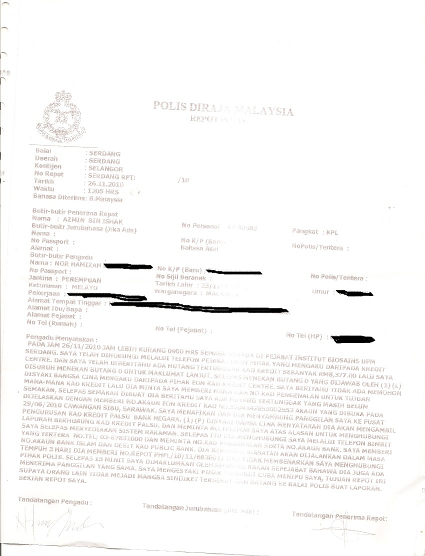 1. Pegawai penyiasat menghubungi kita dan meminta kita supaya merujuk dan memaklumkan no report yang diberi. No report palsu bagi kes saya PHFL/10/116838011
